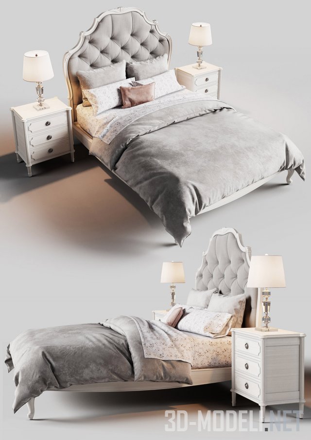 В наборе прикроватные тумбочки белого цвета (Restoration Hardware SOREN NIGHTSTAND). Их размеры: 40 x 55 x 66 cм. На тумбочках настольные лампы Restoration Hardware GRACE CRYSTAL TABLE LAMP (30 x 60 cм).