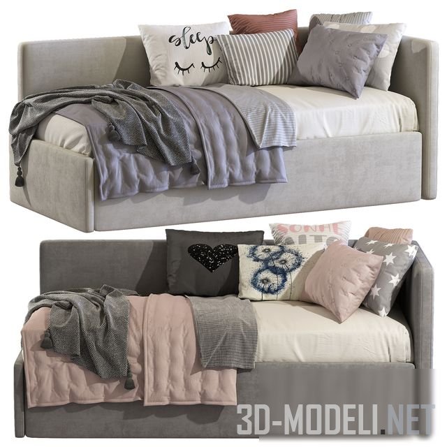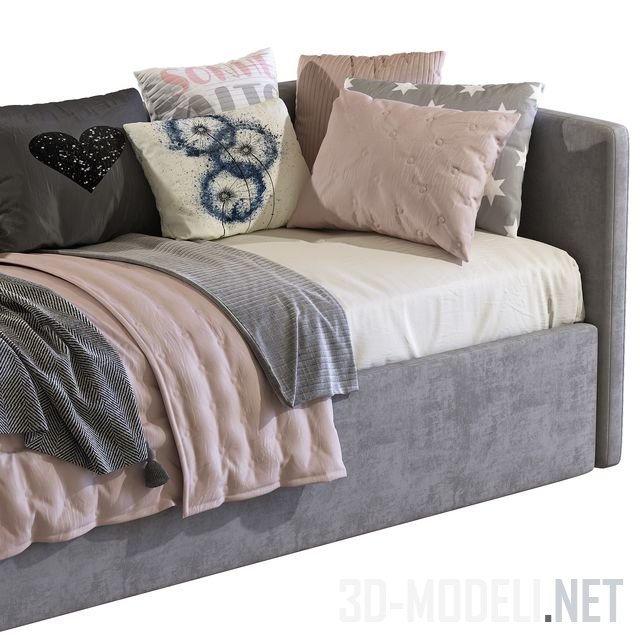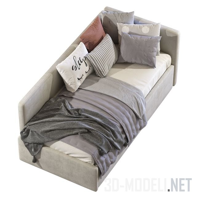 Удобная детская кровать Be Max Twils с двумя мягкими бортиками по длинной и короткой стороне, обтянутыми тканью. На кровати лежит высокий белый матрас, мягкие стеганые пледы и множество декоративных подушек. Размер матраса: 90 х 200 см. В архиве два разных цвета обивки кровати.