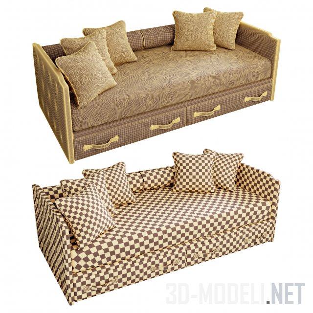 Современная кровать Manifesto Valigia, с обивкой желтого цвета (выполнена с использованием разных обивок и в разных цветах). Для этого выбраны ткани марки Chivasso, из коллекции Perino velvet, Caledon и Fiore (текстура бесшовная).