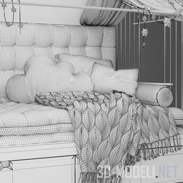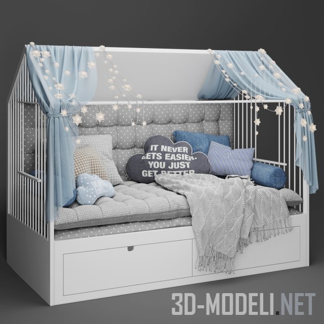Односпальная детская кроватка с верхней частью в форме домика, что создает уютную зону и простор для творчества малышей. Кровать внизу оснащена удобными выдвижными ящиками, где можно хранить постельное белье. Мягкая обивка и матрас внутри «домика» делают его очень комфортным. Множество декоративных подушек, обычных и в форме облаков вносят реализм и уют. «Крыша» дополнена нежного оттенка шторами и гирляндами.
