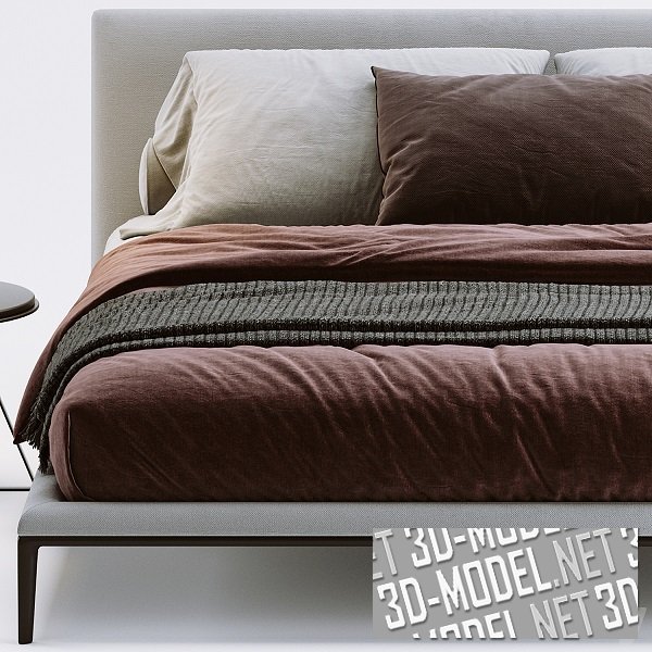 Современная минималистичная двухспальная кровать Atoll от B&B Italia, с белой обивкой корпуса и мягкого изголовья. Тонкая черная рама и изящные ножки перекликаются с черными круглыми прикроватными столиками на трех ножках. Коричневая подушка и одеяло, темно-серый плед на белом постельном белье - выступают контрастным акцентом в композиции.