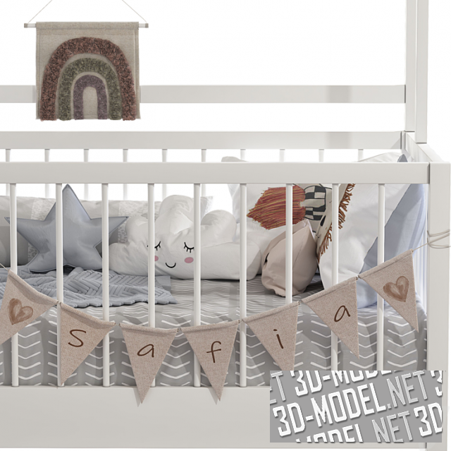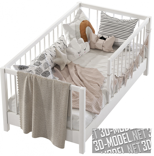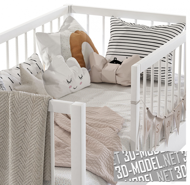 Милая и романтичная детская кроватка белого цвета. Наполнение (подушки и постельное белье) представлены в двух вариантах цвета, белый с голубым и белый с розовым. Размер матраса для такой кровати составляет 90 x 180 см.