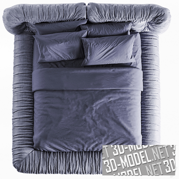 Современная двухспальная кровать Milano от Baxter (дизайнер: PAOLA NAVONE) на низких ножках с декоративной плиссировкой корпуса и мягкой невысоким мягким изголовьем. Корпус и изголовье обиты текстилем серовато-фиолетового цвета. Изголовье дополнительно декорировано двумя рядами втяжек. Постельное белье - в цвет корпуса, но насыщеннее. Габарит кровати: 248х258х105см.