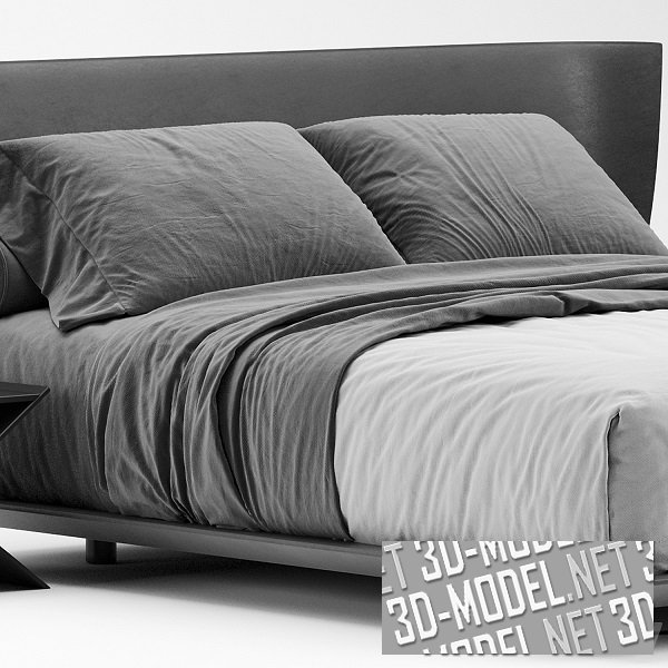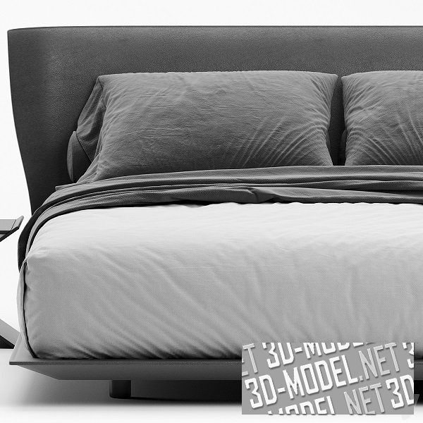 Современная кровать на низкой платформе и с высоким матрасом Alys от B&B Italia. Плоское изголовье имеет подвернутые внутрь нижние углы трапеции. Корпус кровати и изголовье обиты серым. В серых цветах и постельное белье. Черные прикроватные столики выполнены на «Х»-образном основании с прямоугольной столешницей.