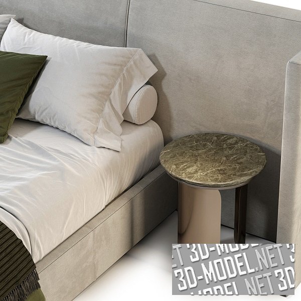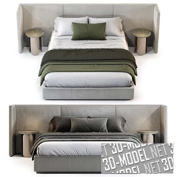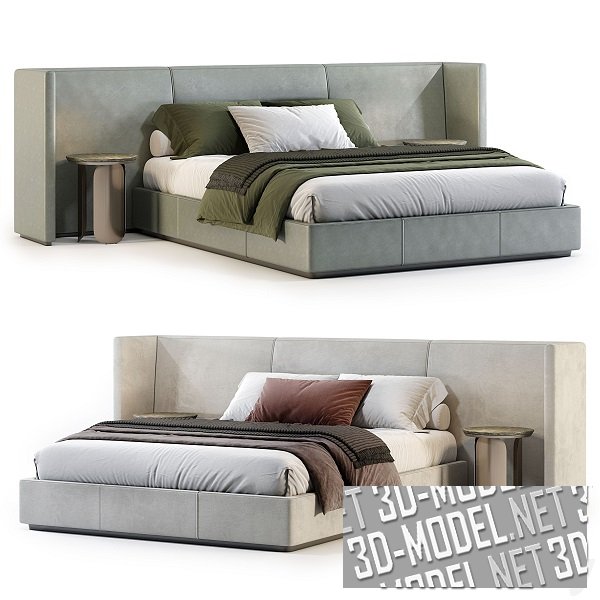 Современная двухспальная кровать Alessa Shelter от Restoration Hardware с высоким и длинным, пятисекционным изголовьем и парой круглых прикроватных столиков на трех овальных металлических ногах. Боковые секции мягкого изголовья отогнуты в сторону кровати под прямым углом. Представлены несколько цветовых сочетаний велюровой обивки\одеяла\подушки и белого постельного белья. Предложенные тона одеяла и подушки - спокойные, темные (темно-зеленый, бледно-коричневый, графитово-серый). Велюр - в оттенках светло-серого.