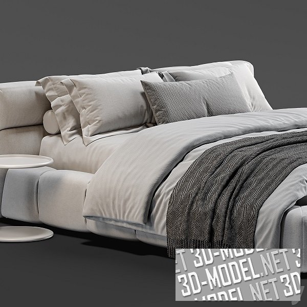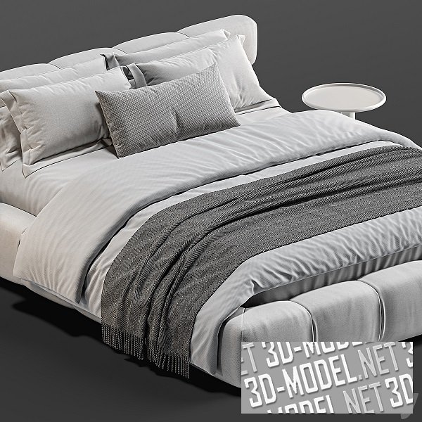 Современная двухспальная кровать Tufty Bed от B&B Italia с очень мягкой обивкой корпуса и изголовья. Благодаря глубокой сегментарной прострочке, обивка разделена на небольшие мягкие подушки. Светло-серая обивка и постельное белье такого же цвета, пять крупных подушек, высокий матрас, одеяло и плед - все это нагромождение тоже «работает» на создание «мягкого» объекта. Пара круглых прикроватных столиков белого цвета традиционно размещены у изголовья.