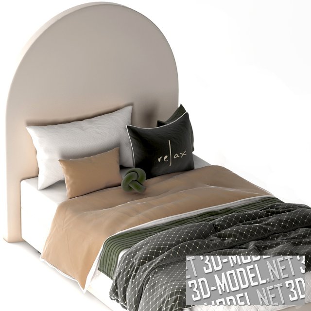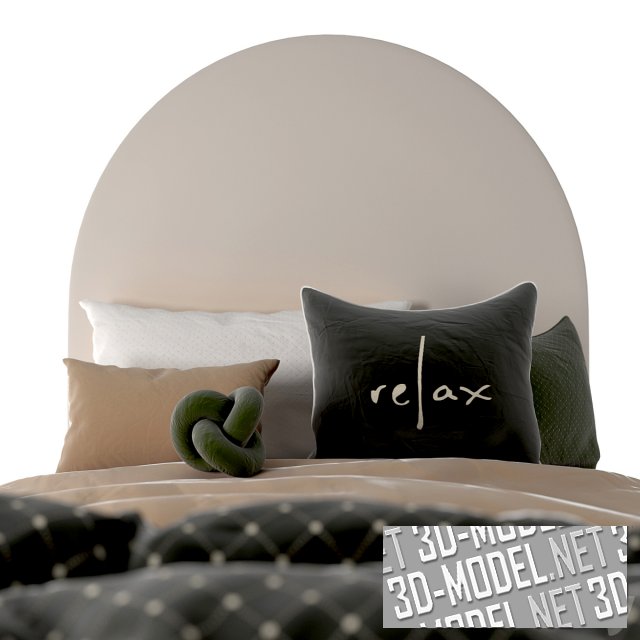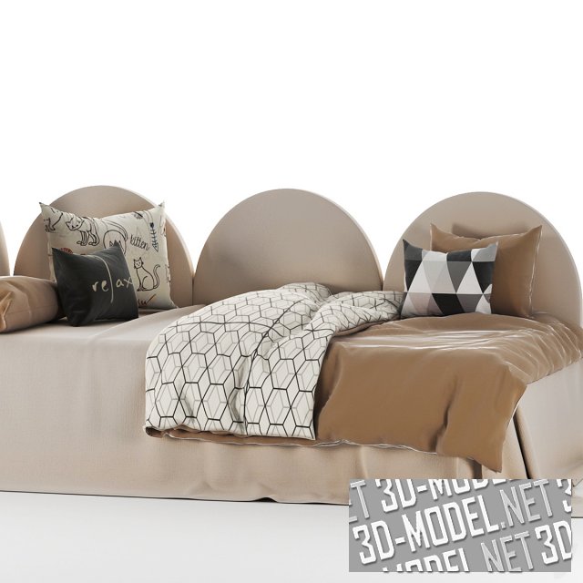 Два комплекта современного постельного белья Day и Rest от Peonihome, в бело-черно-охристых и черно-зеленом тонах. Белье постелено на двух кроватях с арочными изголовьями. Одна кровать - с высоким арочным изголовьем. Вторая - угловая. Борта по короткой и длинной стороне изготовлены из арочных элементов поменьше. Обивка кроватей - бежевая.