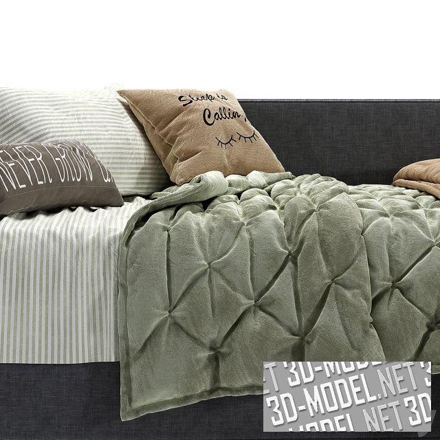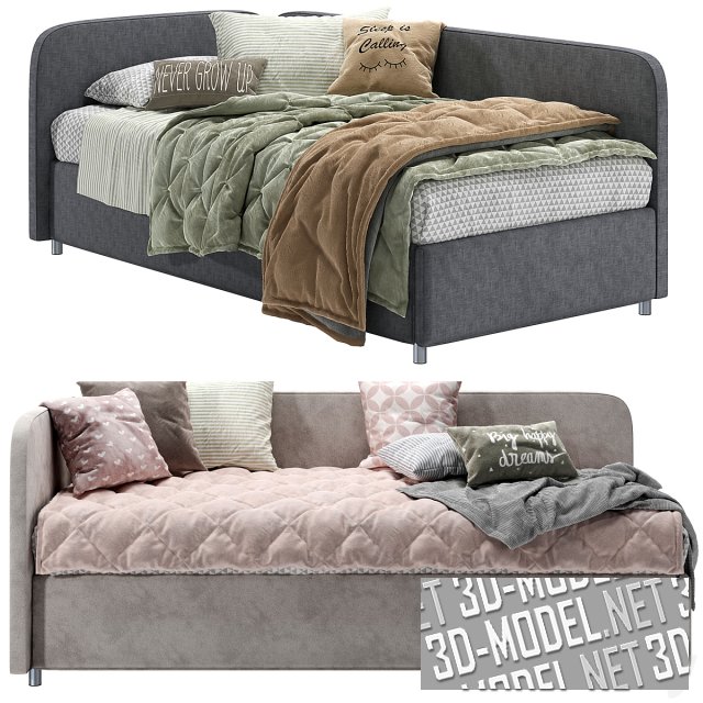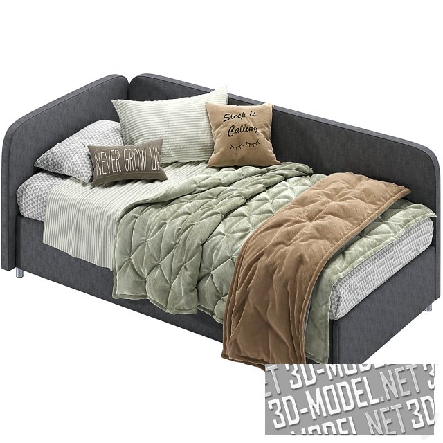 Детская угловая кровать Aphrodite с двумя спинками длинной и короткой. Кровать на четырех маленьких хромированных ножках, обтянута плотным текстилем серого или графитового цвета. Мягкие стеганые покрывала и цветные декоративные подушки придают ей уютный вид. Размеры кровати: 105 х 205 х 80 см, размеры матраса: 90 х 190 см.