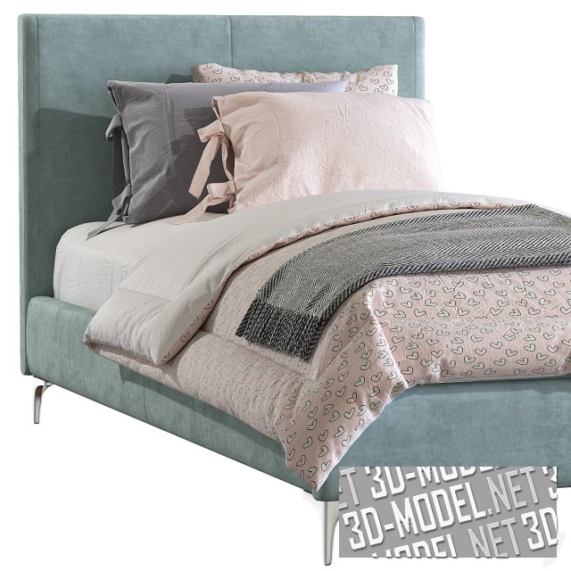 Современная кровать Andes Deco Upholstered с прямой мягкой спинкой и маленькими металлическими ножками. На кровати лежит матрас, три большие мягкие подушки неярких оттенков, толстое одеяло и темный плед с бахромой. Такая кровать хорошо подойдет для интерьера комнаты подростка. Размер матраса: 200 x 90 см h 100 см.