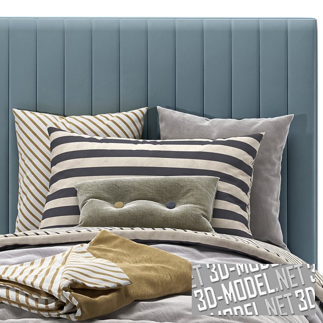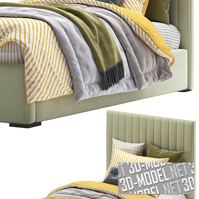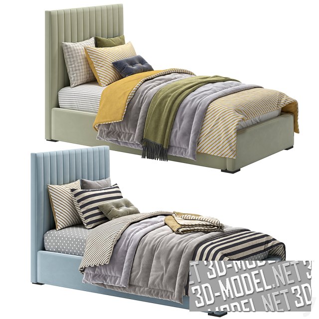 Уютная односпальная кровать Mareberg с высокой мягкой спинкой, декорированной вертикальной прострочкой. Кровать обтянута велюром голубого или светло-бежевого цвета. На толстом  матрасе лежат пышные одеяла, пледы и подушки в тон одеялам.