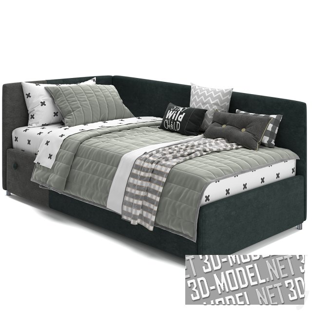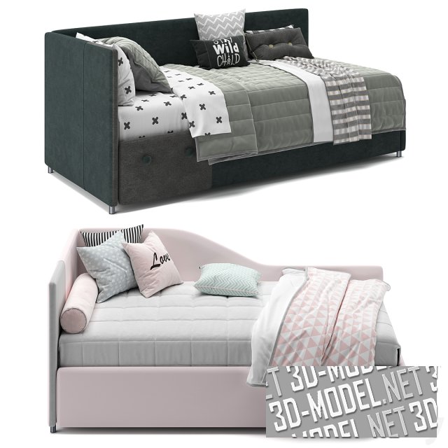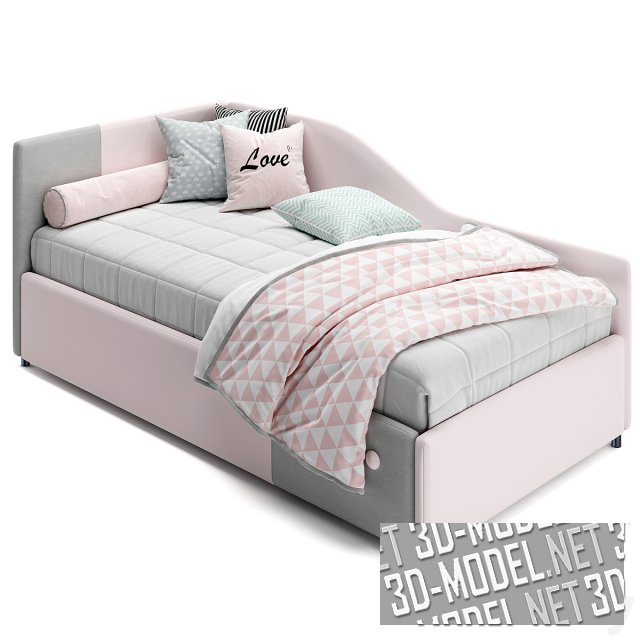 Современная угловая кровать Joy в двух вариантах отделки: в сочетании пастельных розового с серым и черно-серо-белая. У моделей отличается и один из мягких бортов кровати. У более брутальной, черной кровати он прямой. У более женственной, розовой - с волнистым срезом верхней кромки. Габарит матраса: 190 х 97 см. Габарит кровати: 200 х 110 х 85 см. Кровати оснащены комплектами постельного белья и подушками в цвет и тон обивки.