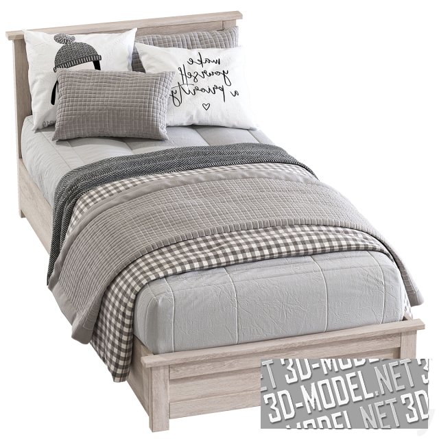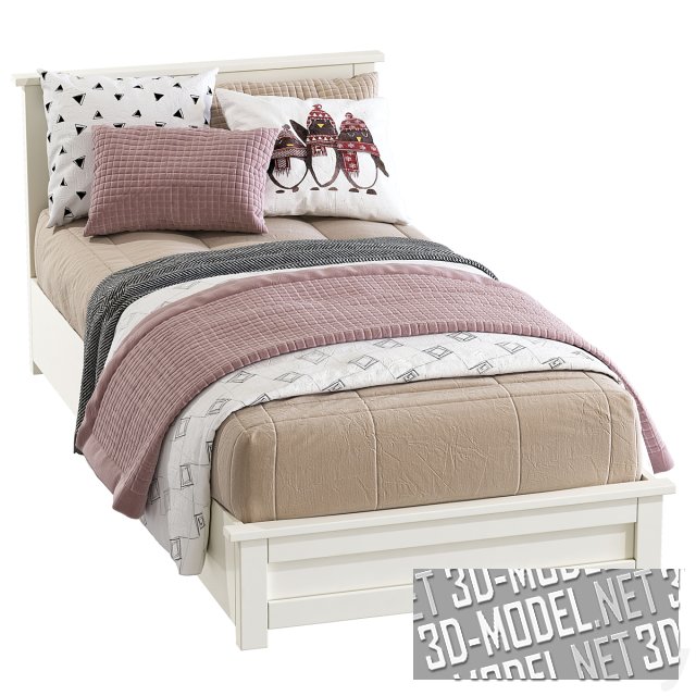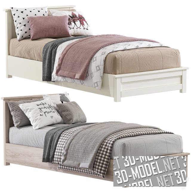 Современные односпальные деревянные кровати для детской комнаты. Деревянные корпуса на небольших ножках имеют высокие прямоугольные изголовья без изножья. Матрасы высокие. Представлено два варианта. Один «брутальнее», с корпусом из беленого дуба, с постельным бельем, подушками и одеялами в серо-голубой гамме. Второй вариант - более нежный. Корпус покрыт белым матовым лаком. Высокий матрас - бледно-бежевый. Постельное белье, одеяла и подушки - белые, с темными элементами цвета пыльный розовый. На одной из подушек - аппликация в виде трех веселых пингвинов в шарфиках и шапках. Размер матраса: 90 x 200 см.