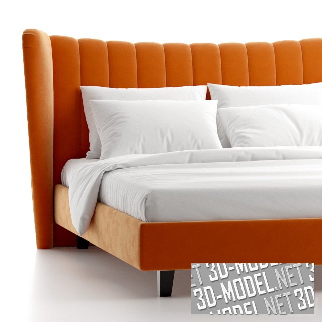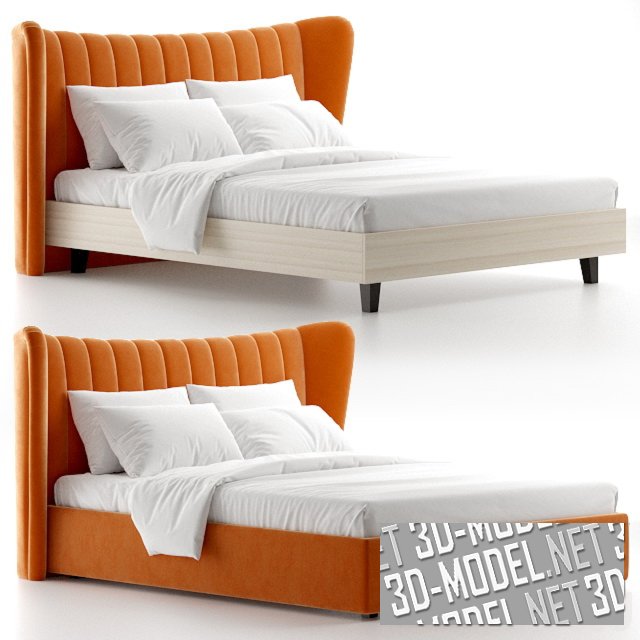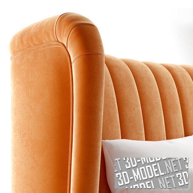 Двуспальная кровать Queen Agata на деревянном каркасе. Кровать имеет высокую спинку с «ушами», обтянутую велюром апельсинового оттенка с декоративной вертикальной прострочкой. Коричневые деревянные ножки красиво сочетаются с цветом обивки. На кровати лежит белоснежное постельное белье. Габаритные размеры: длина 225 см, ширина 203 см, высота 112 см, размер спального места: 160x200 см.