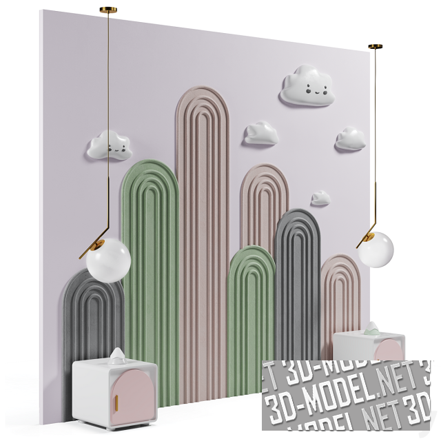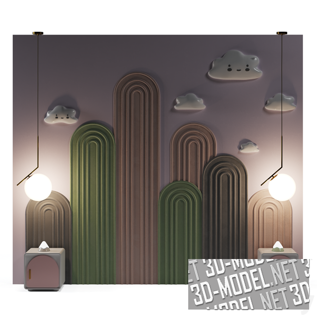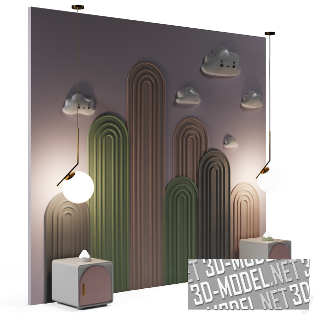 Оригинальное изголовье, которое отлично украсит любую современную детскую кровать. Для отделки были использованы материалы: ткань и штукатурка. Также в комплект вошли: подвесной светильник Arte Lamp BOLLA-UNICA, ночник Mount Fuji, прикроватная тумба Cute Side Table. Все предметы интерьера гармонично сочетаются между собой и украшают детскую комнату. Добавляют атмосферного настороения милые забавные тучки.