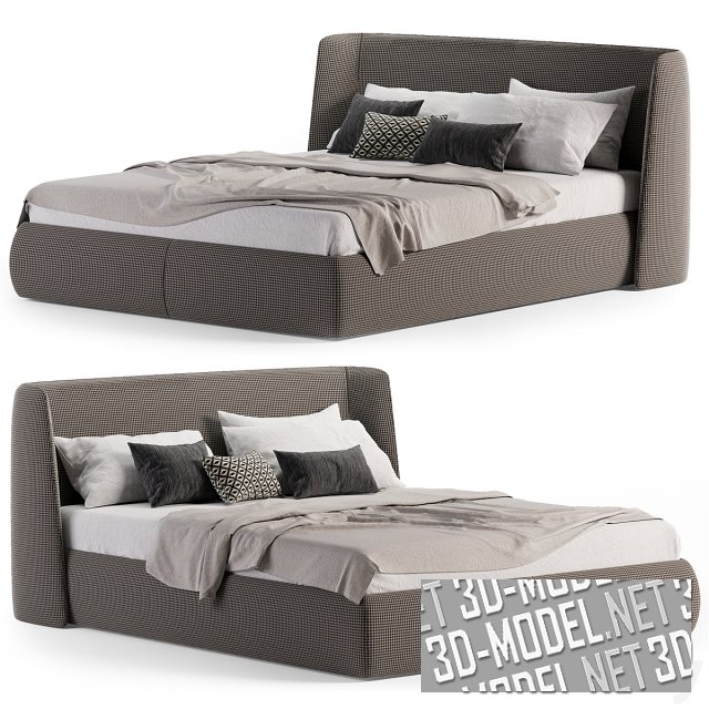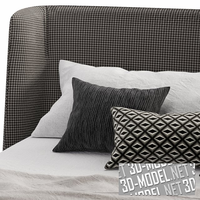 Современная двухспальная кровать Basket от Bonaldo, с обивкой в мелкую черно-белую «гусиную лапку» на мягком изголовье и корпусе. Высокое изголовье имеет два небольших отворота по краям, в сторону корпуса. Постельное белье с белой простынью и чехлами на больших подушках укомплектовано светло-серым пледом, темно-серыми и пестрой расцветки подушками.