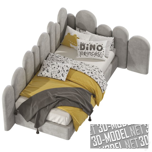 Современная кровать для детской комнаты. Оригинальное изголовье и спинка в форме лепестков делает предмет мебели не только комфортным спальным местом, но и выполняет функцию привлекательного дивана в интерьере. В архиве представлены два варианта обивки (серого и розового цветов). Размер матраса: 90 x 200 см.