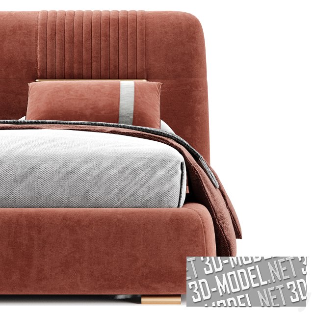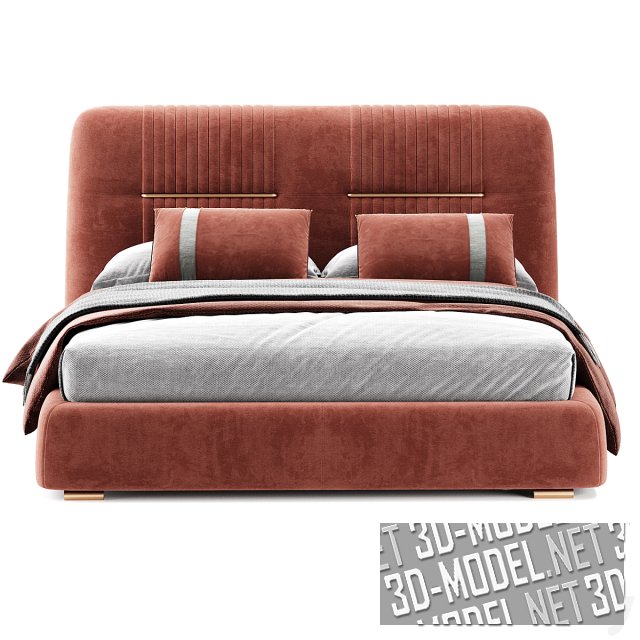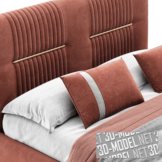 Современная двухспальная кровать Ulivi Salotti Omer. Мягкое массивное изголовье кровати со скругленными гранями декорировано двумя золотистыми металлическими тонкими горизонтальными трубками, дублирующими дизайн небольших ножек корпуса кровати. Также изголовье украшает густая вертикальная прострочка, создающая две широкие рельефные вставки.