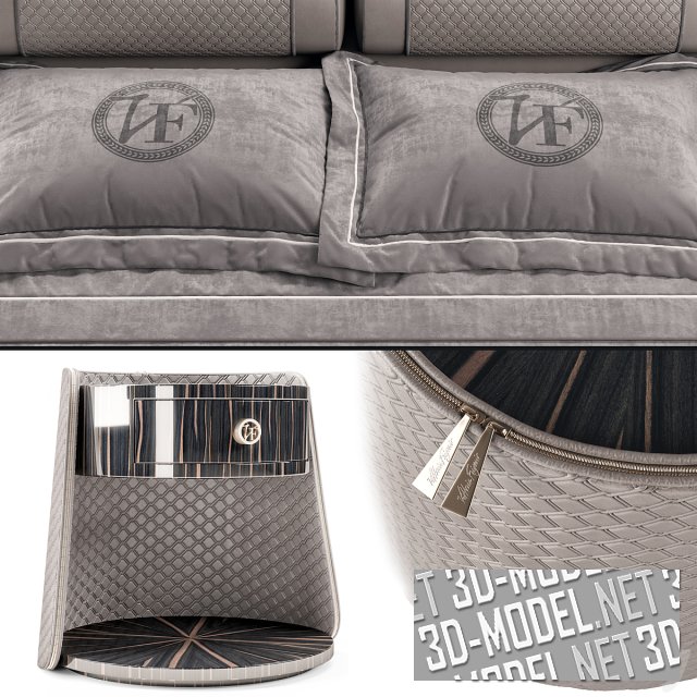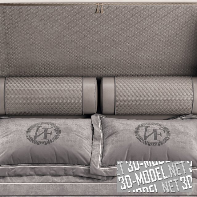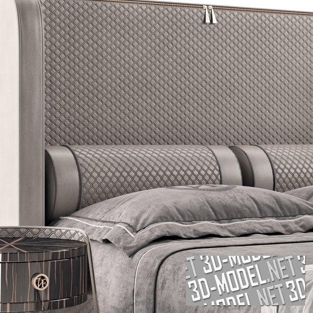 Корпус кровати обтянут материалом серо-бежевого благородного цвета. Серо-коричневый матрас, жемчужно-серое бархатное постельное белье с темными логотипами на подушках и прикроватные тумбы Contarini сложной формы, с элементами из текстурированной, как на изголовье, кожи и дерева с контрастной текстурой формирую элегантный ансамбль. Габарит кровати: 198х253х142см. Габарит тумбы: 48х60х54см.