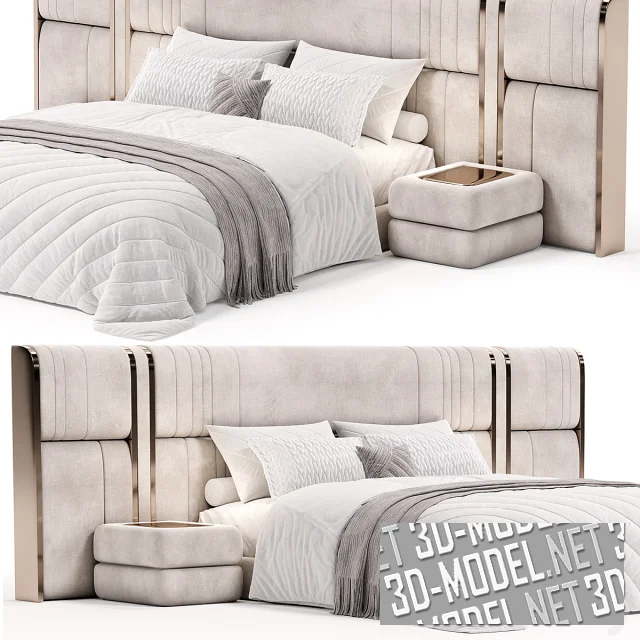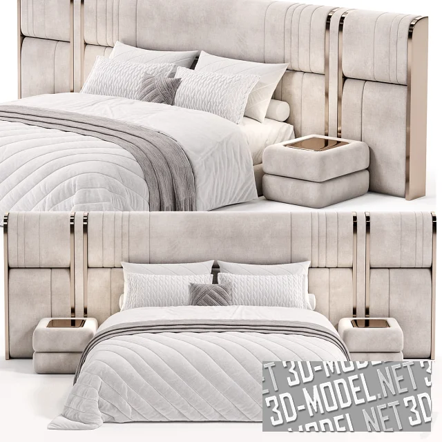 Современная двухспальная кровать Nova XL от HESSENTIA, с двумя прикроватными столиками. Широкое прямоугольное изголовье состоит из нескольких мягких секций с вертикальной прострочкой, разделенных вставками их золотистого металла. Боковые торцы изголовья тоже металлические, золотистые.