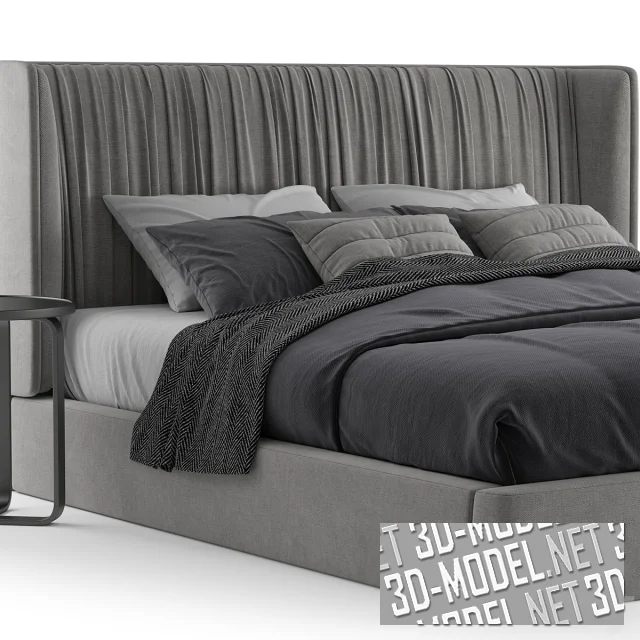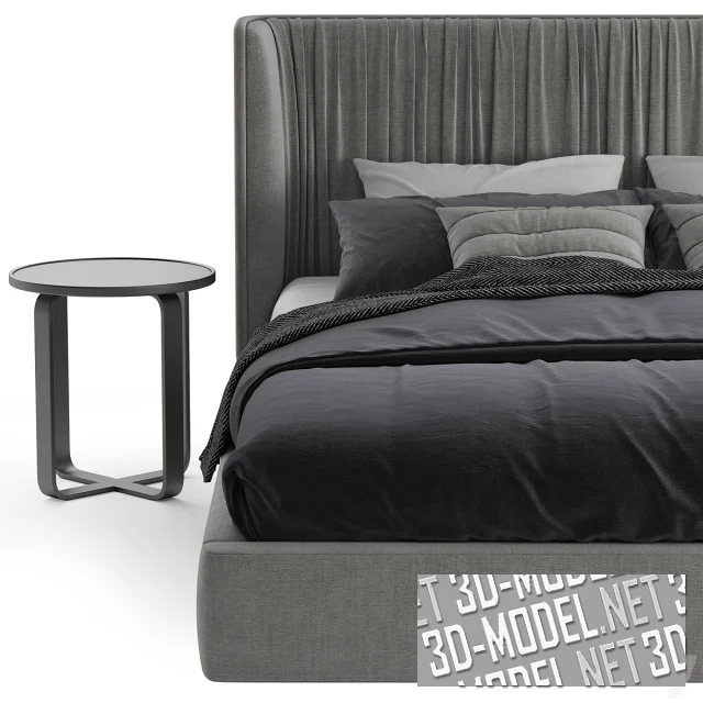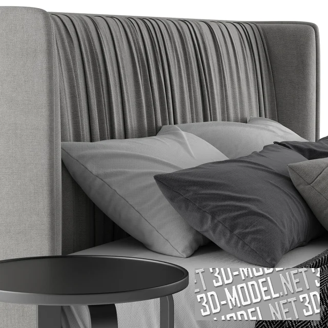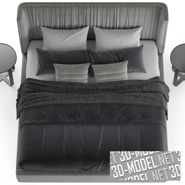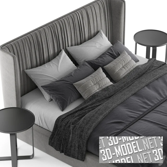 Современная двухспальная кровать Arte Brotto PRINCIPE в темных тонах, с парой круглых приставных столиков. Круглые черно-серые столешницы столов смонтированы на четырех ножках из полосы, слитых в нижней плоскости в крестовины. Высокое мягкое изголовье кровати подвернуто по краям внутрь и обито серым текстилем с декоративными складками. Корпус без ножек тоже обит серым. Постельное белье в серых и темном серо-фиолетовом цветах дополняют общий стиль элементов. Габарит кровати: 200х210х110см.