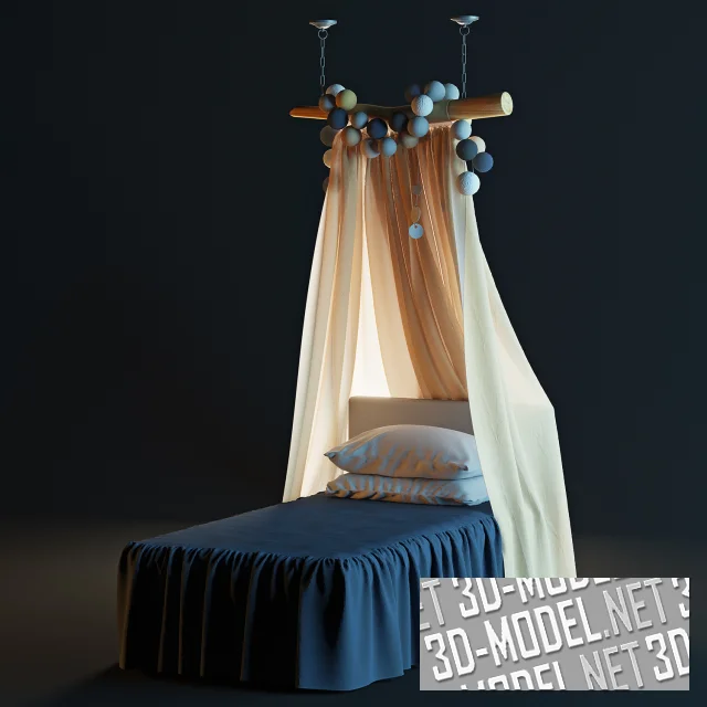 Очаровательная детская кроватка с балдахином нежного персикового цвета. Синее покрывало и гирлянда голубых и синих шариков наверху балдахина красиво гармонизуют с персиковым цветом.