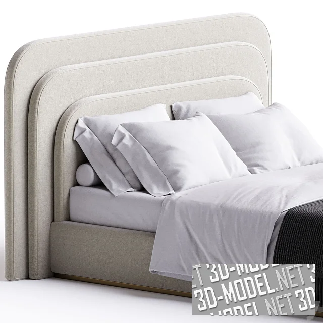 Двухспальная кровать Voyage Royal от Elie Saab Maison (дизайнер: Carlo Colombo). Мягкое, высокое, «трехслойное» изголовье в стиле арт-деко выполнено в виде трех разновеликих прямоугольных панелей со скругленными верхними углами, размещенных от большей на заднем плане к меньшей на переднем. Изголовье и массивный корпус кровати на невысоком золотистом металлическом цоколе обиты текстилем цвета слоновой кости. Снежно-белое постельное белье дополнено черно-серым пледом. Габарит кровати: 254х228х130см.