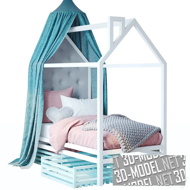 Современная детская кроватка от Doodywoodydom с конструкцией-балдахином в виде домика и высоким мягким изголовьем. Каркас балдахина и кровати изготовлен из белого бруса. Под кроватью смонтированы два больших ящика из светло-голубого бруса. Ткань алькова выполнена из текстиля бирюзового цвета. Обивка из бледно-голубого материала декорирована круглыми пуговками-втяжками. Постельное белье подобрано в бело-розовых тонах и дополнено светло-серым пледом крупной вязки и декоративной подушкой в виде сердечка с чехлом из искусственного меха.