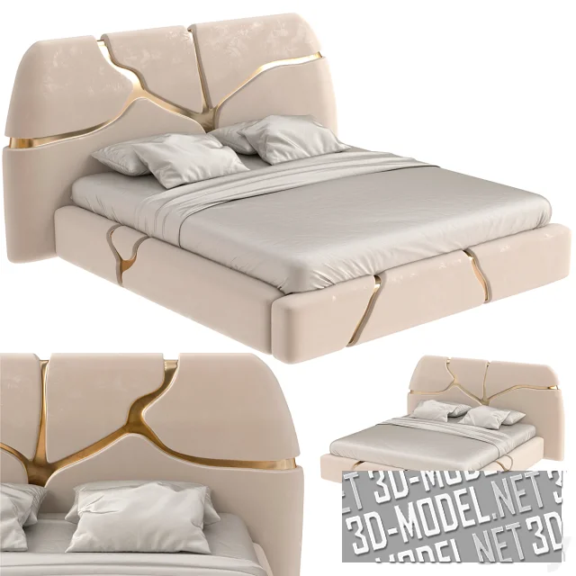 Эффектная современная кровать ELGON от Roberto Cavalli, с широким фигурным изголовьем. Корпус и изголовье обиты нежным светло-бежевым материалом и декорированы глубокой вставкой из золотистого металла, имитирующей крупные криволинейные трещины на поверхности. Постельное белье светлое, жемчужно-белое.