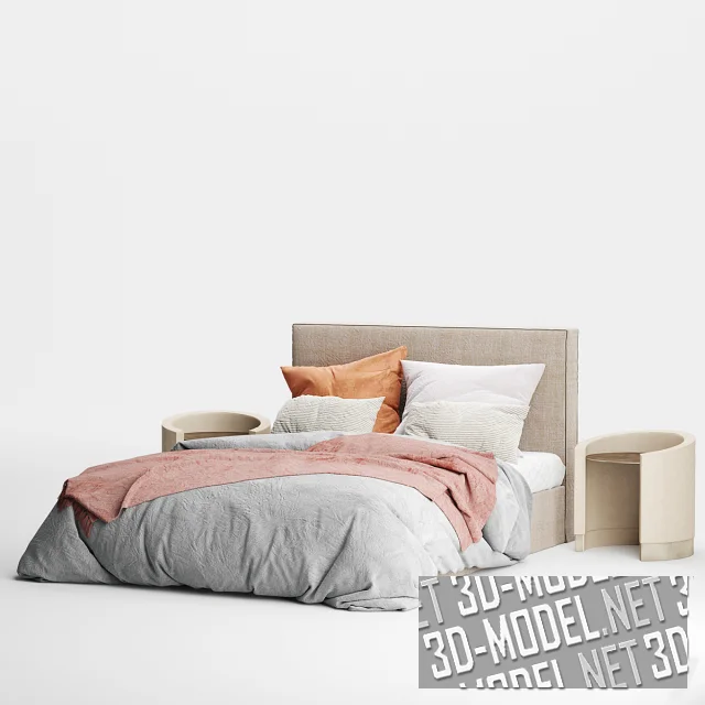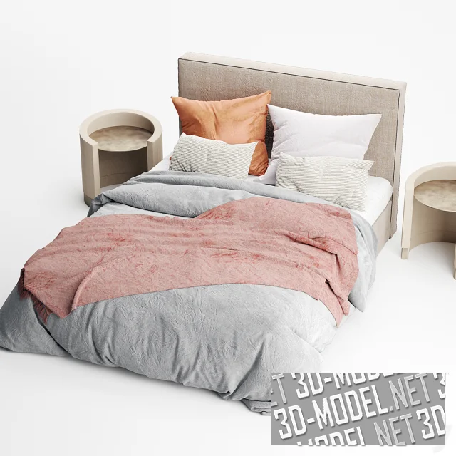 Комплект современной мебели для спальни - светло-бежевая кровать с высоким мягким прямоугольным изголовьем Vittoria от Globeest, постельным бельем и подушками в нежных оттенках светло-серого, светло-оранжевого и светло-терракотового и прикроватные тумбы Kennedy. Светло-бежевые тумбы с круглыми столешницами и небольшими неравномерным выступами-бортиками, образованными верхней кромкой корпусов тумб с С-образным сечением. Габариты кровати: 160х220х110см. Габарит тумбы: 59х50х61см.