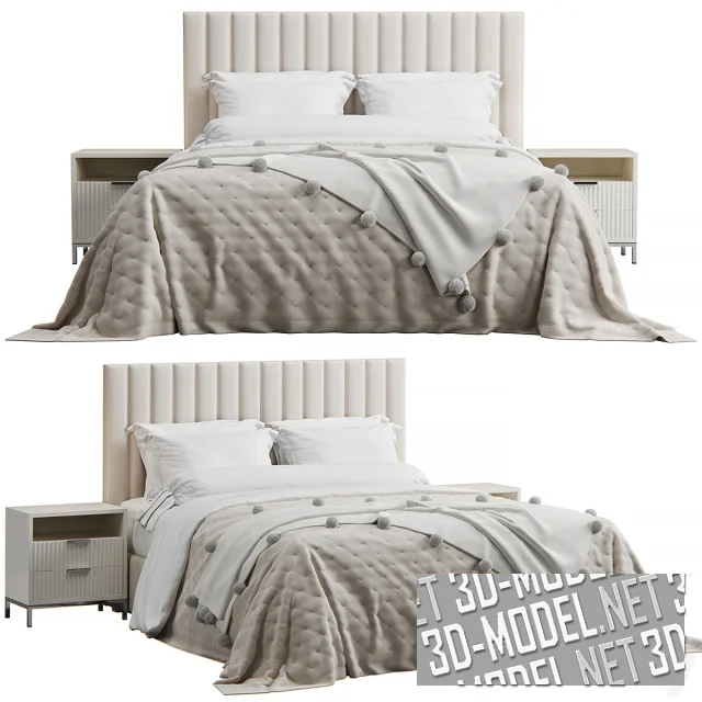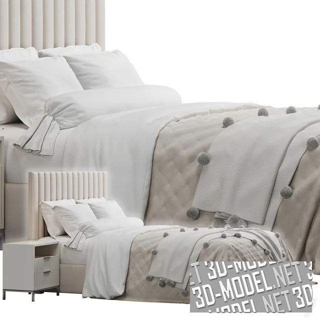 Современная кровать формата Queen - модель Kennedy, с парой прикроватных белых тумб. Высокое прямоугольное изголовье имеет мягкую белую (с легким теплым оттенком) обивку, разделенную вертикальными швами на 14 панелей. Постельное белье, подушки и стеганное одеяло - белого цвета и цвета слоновой кости. Плед, наброшенный сверху, декорирован по кромке мягкими серыми помпонами. Габарит кровати: 215х175х125см. Тумбы имеют небольшую открытую полку под столешницей и два выдвижных ящика с частыми вертикальными канавками на фасадах.