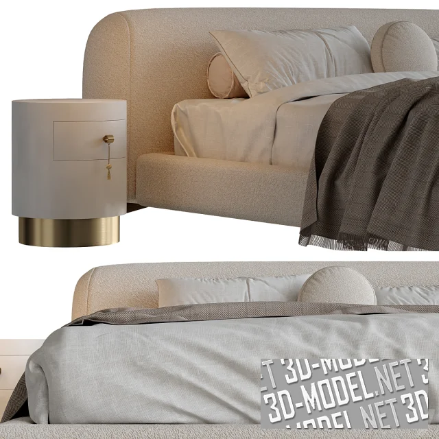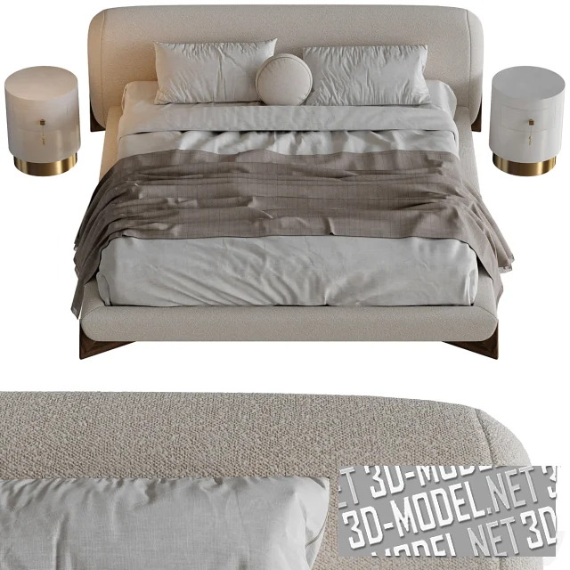 Современная двухспальная кровать с низкой мягкой спинкой - Softbay от Porada, а также прикроватные тумбы T007 Any-Home, цилиндрической формы, белые с золотистым брашированным цоколем. Габарит матраса кровати: 180х200см. Невысокий корпус смонтирован на деревянных ножках, выполненных в виде треугольников. Толстое мягкое изголовье и корпус обиты белой буклированной тканью. Белое постельное белье дополнено серым пледом.