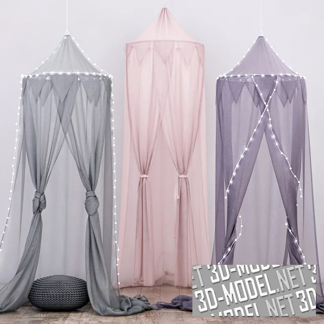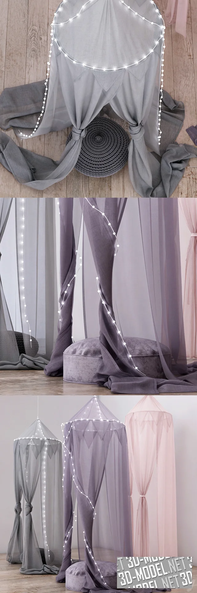 Три варианта игровых балдахинов для детской комнаты от Restoration Hardware. Подвесной купол, опирающийся на горизонтальное кольцо, декорирован треугольными вымпелами. Задняя стенка, купол и боковые полотна изготовлены из полупрозрачной ткани (серого, розового и фиолетового цветов). Модели отличаются не только цветом ткани, но и вариациями фиксации полотен «створок».