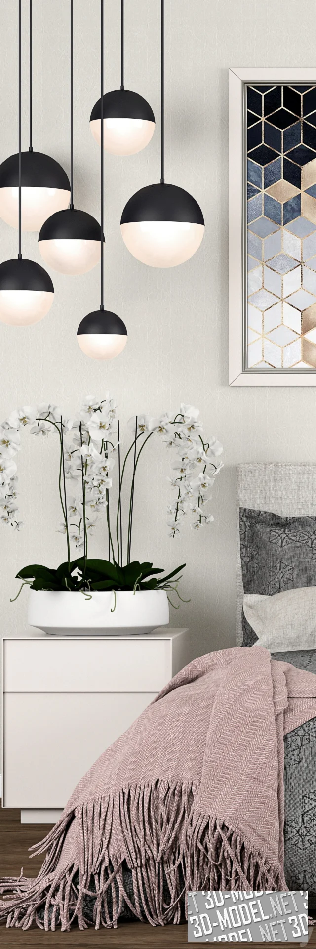 Наполнение современной спальной комнаты с небольшой кроватью, белыми прикроватными тумбами, подвесными светильниками, парой абстрактных панно и белыми орхидеями в белых горшках. Обивка высокого прямого изголовья и чехлы средних подушек выполнены из грязно-белого текстиля с текстурой льняного холста. Чехлы больших подушек и пододеяльник - серые с орнаментом. Плед и чехол пятой подушки бледно-розовые.