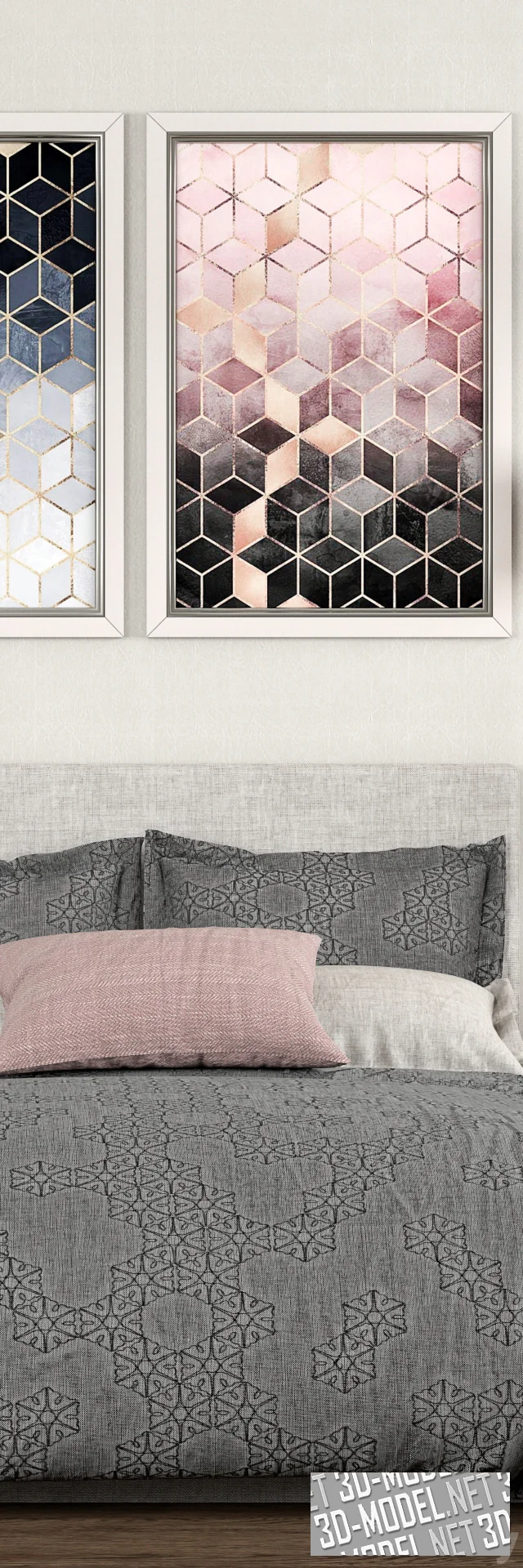 Подвесные светильники выполнены в виде двух групп шаровидных плафонов на длинных шнурах (с белой светорассеивающей полусферой снизу и черной полусферой рефлектора) нескольких типоразмеров, висящих над тумбами. В диптихе в белых рамках изображены паттерны из ромбов, складывающиеся в трехмерные кубики. Заливки ромбов варьируются от черного до грязно-розового и грязно-синего и белого.