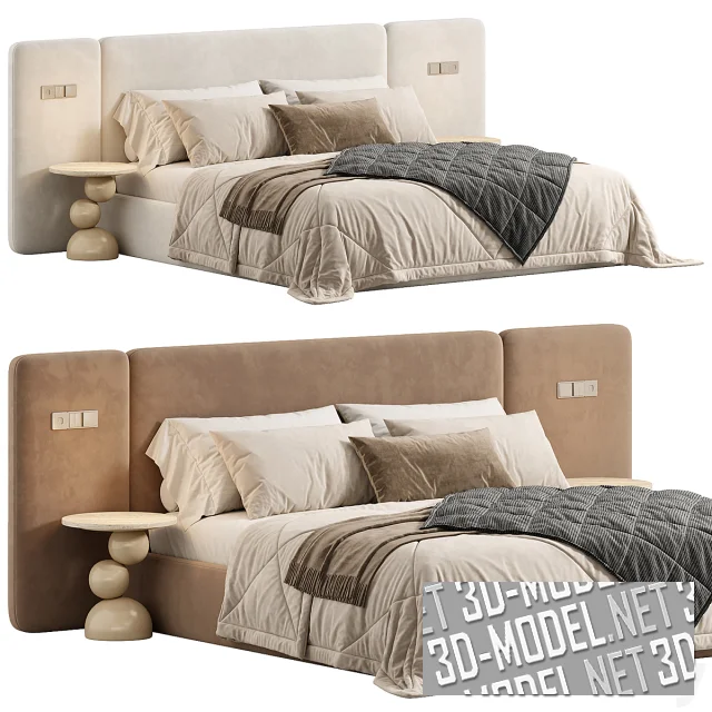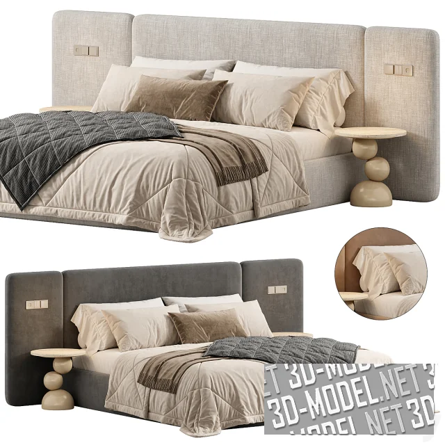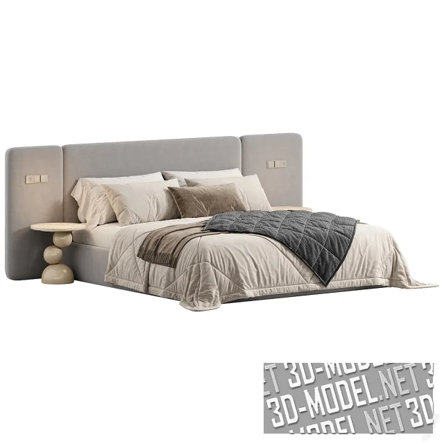Современная двухспальная кровать LOTOS и деревянные круглые прикроватные столики с опорами из трех бежевых шаров. Мягкое прямоугольное высокое изголовье разделено на три панели: центральную (в ширину кровати) и две вертикальные панели поменьше (справа и слева). На боковых панелях смонтированы рамки с розетками и выключателями. Обивка корпуса и мягкого изголовья представлена в нескольких вариантах: молочно-белый, серый, темно-серый и бежевый велюр, светло-серый текстиль с текстурой. Постельное белье и подушки подобраны в сочетании светло-бежевого, светло-коричневого цветов. Стеганое одеяло - в мелкую черную и светло-серую полоску.