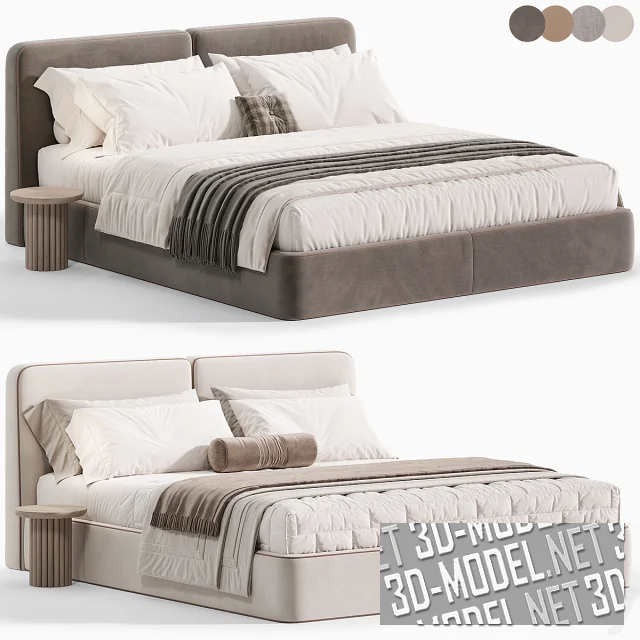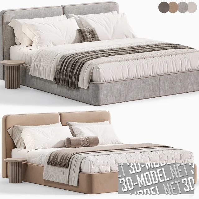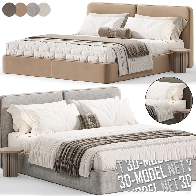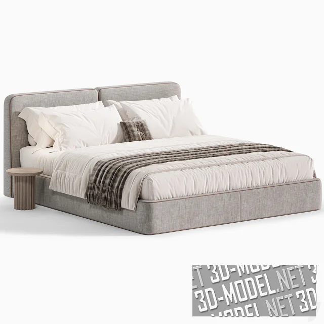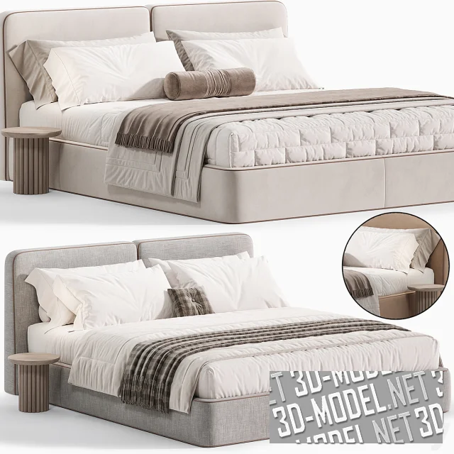 Современная двухспальная кровать Imole от One Home с круглыми прикроватными столиками из массива дуба. Кровать с габаритом 200х220х92см имеет мягкое изголовье, состоящее из двух прямоугольных подушек и высокий обитый мягкой обивкой корпус без видимых ножек. В швы по контурам элементов вшит светло-коричневый декоративный шнур. Комплект постельного белья представлен в двух вариантах: белое со светло-коричневым валиком и пледом, белое с темно-серым пледом и маленькой квадратной подушкой в клетчатом серо-коричневом чехле с пуговкой-втяжкой.