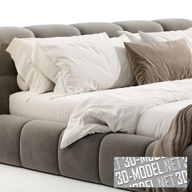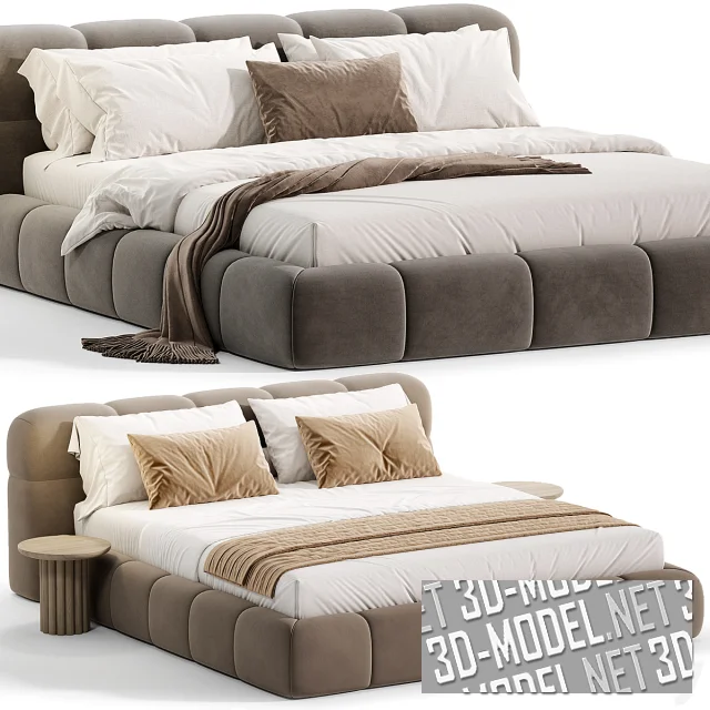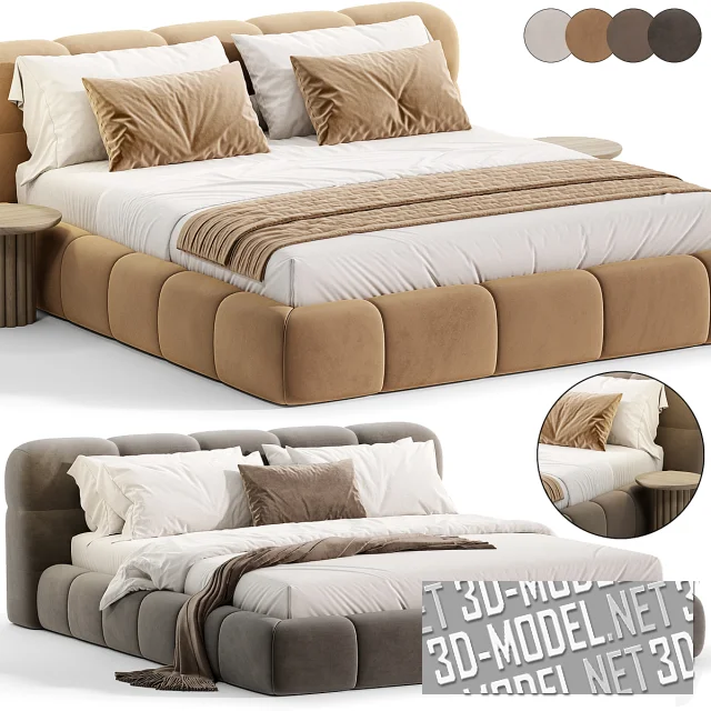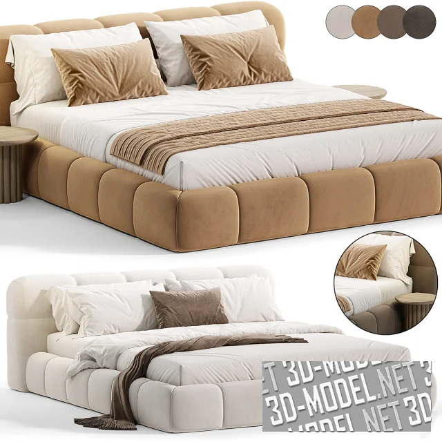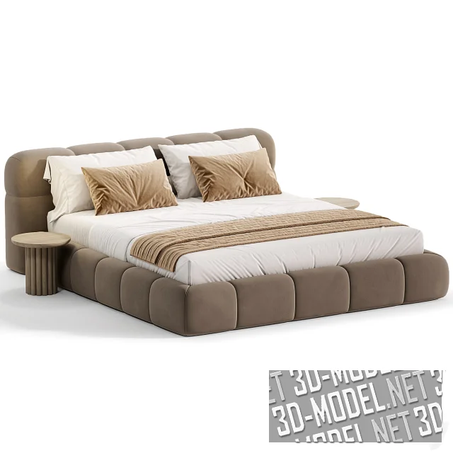 Низкая и широкая двухспальная кровать Guarul от Elmalek, с парой круглых деревянных прикроватных столиков в комплекте. Мягкая обивка корпуса и низкого изголовья разделены прострочкой, разделяющей поверхности на аппетитные «ломтики». Обивка представлена в четырех вариантах велюра: белом, карамельно-охристом, коричневом, темно-сером. Габарит кровати: 180х210х140см, ширина изголовья - 220см. Габарит прикроватного столика с центральной опорой, «собранной» в цилиндр из деревянных деталей круглого сечения: d/h. Белое постельное белье дополняют подушки и плед в цвет обивки (кровать с белой обивкой дополнена коричневым пледом и маленькой подушкой).