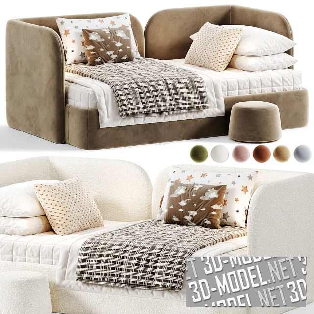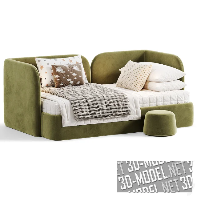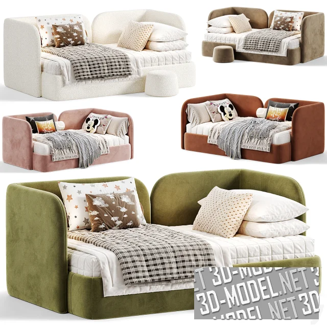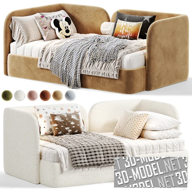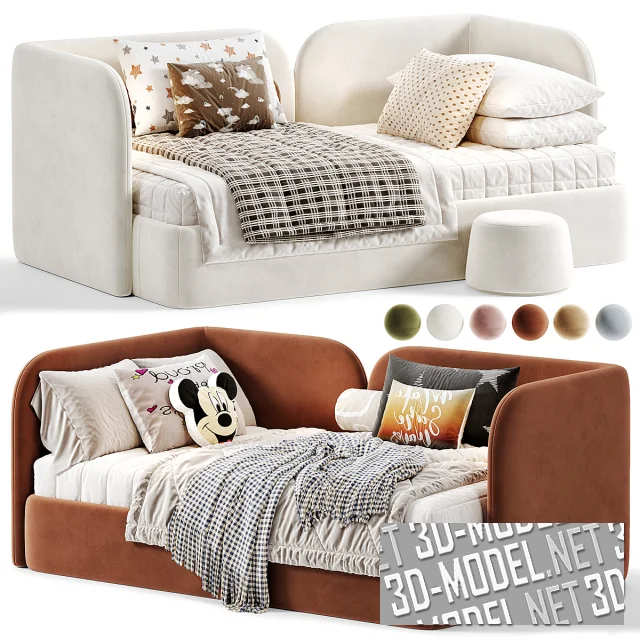 Современная детская диван-кровать Amalia 90 от Divan.ru. В комплекте с прикроватным круглым пуфом с обивкой в цвет обивки. Корпус кровати имеет довольно высокий бортик со скругленными углами. Спинка состоит из двух угловых скругленных на углах элементов. Кровать обита велюром. Представлено пять вариантов цвета: оливковый, темно-терракотовый, бледно-розовый, белое букле, светло-коричневый. Габарит кровати: 220х140х87см. Постельное белье белое, дополненное пестрыми декоративными подушками (в том числе - фигурной с портретом Микки-мауса) и пледами.