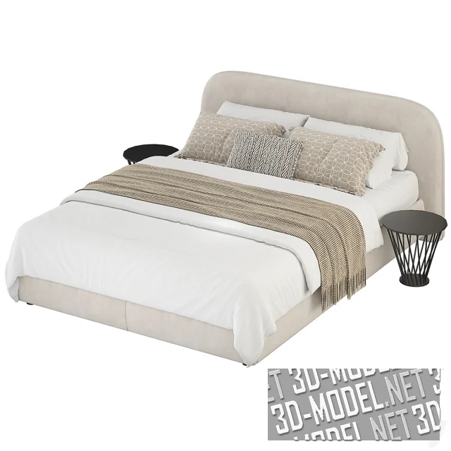 Современная двухспальная кровать Carolina от Dantone home, с парой прикроватных черных круглых столиков в комплекте. Небольшое мягкое изголовье со скругленными углами и корпус кровати обиты велюром цвета слоновой кости. Вторая пара подушек - в чехлах бежевого цвета с белыми контурными паттернами. Пятая, прямоугольная небольшая подушка - в чехле с бело-коричневым паттерном «ёлочка». Плед на белом одеяле в мелкую коричневую точку на светлом фоне. Опоры черных прикроватных круглых столов набраны из группы черных металлических прутьев, соединяющих столешницу и круглую площадку меньшего диаметра.
