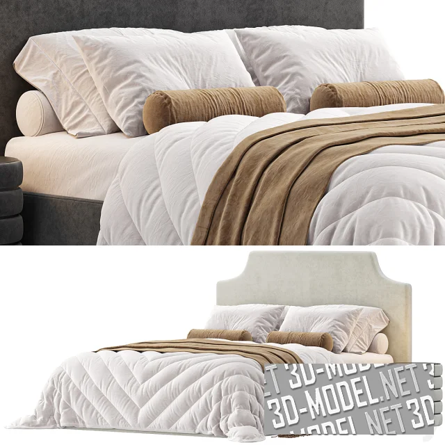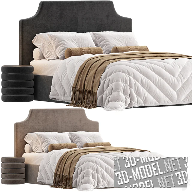 Современная кровать Adona Floor 160 Soft Latte с парой прикроватных круглых столиков. Высокое мягкое изголовье со срезанными скругленными углами и высокие борта корпуса без видимых ножек обиты велюром. Представлено несколько вариантов: латте, графитово-черный, светло-серый. Постельное белье - белое, с мягкими валиками и пледом охристого цвета. Цилиндрические корпуса столов обиты мягким текстилем, дублирующим обивку кровати. Мягкую плоскость разбивают горизонтальные вставки. Круглая верхняя плоскость темного медного цвета.