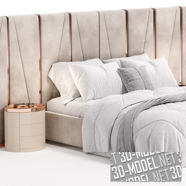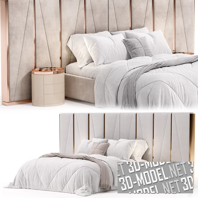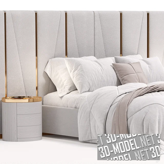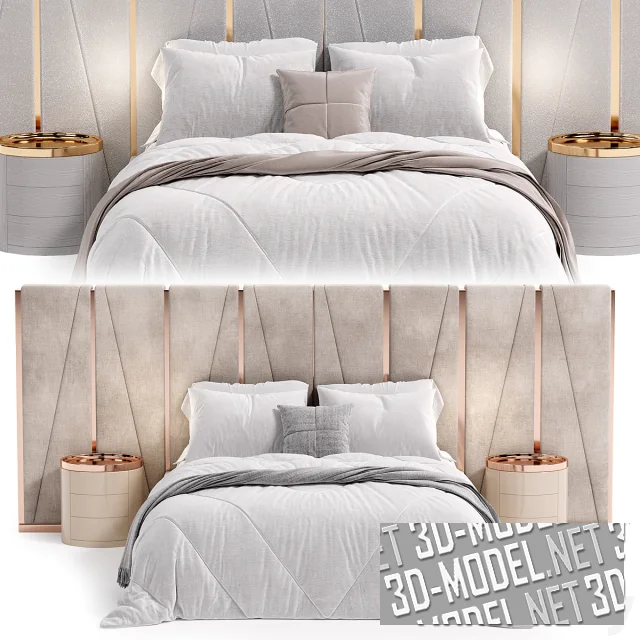 В тумбах обустроено по три выдвижных ящика без ручек на фасадах. Представлено два комплекта. Первый: с белой буклированной обивкой, золотистыми вставками и тумбами из белого с серой текстурой дерева. Постельное белье в первом комплекте - белое со светло-бежевым пледом и декоративной квадратной подушкой. Второй вариант: светло-бежевая обивка с золотисто-розовым металлом, гладкие бежевые тумбы, белое постельное белье с серым пледом и декоративной квадратной подушкой. Габарит одной модели: 260х369х154см.