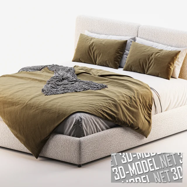 Современная кровать Cloud (в размере Queen) от Sundays Company. Оснащена высокими мягкими подушками в изголовье, создающими удобную спинку для сидящего (утренний кофе, киномарафон на выходной и пр.) Подушки опираются на низкую прямую панель основания изголовья. Корпус кровати, основание и подушки изголовья обиты мягким текстилем приятных оттенков (белое букле и кремовый велюр). Постельное белье - в сочетаниях белого, светло-серого цветов с одеялом и декоративными подушками оттенках хаки.