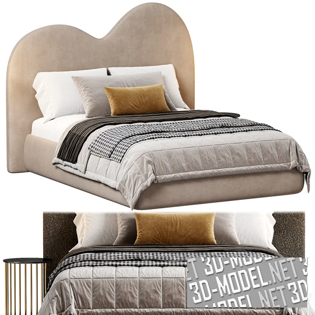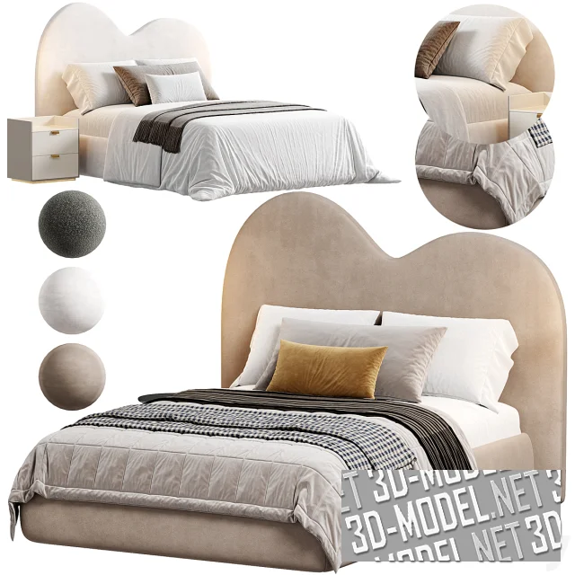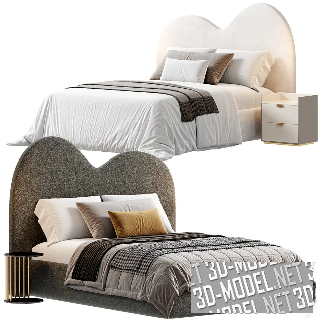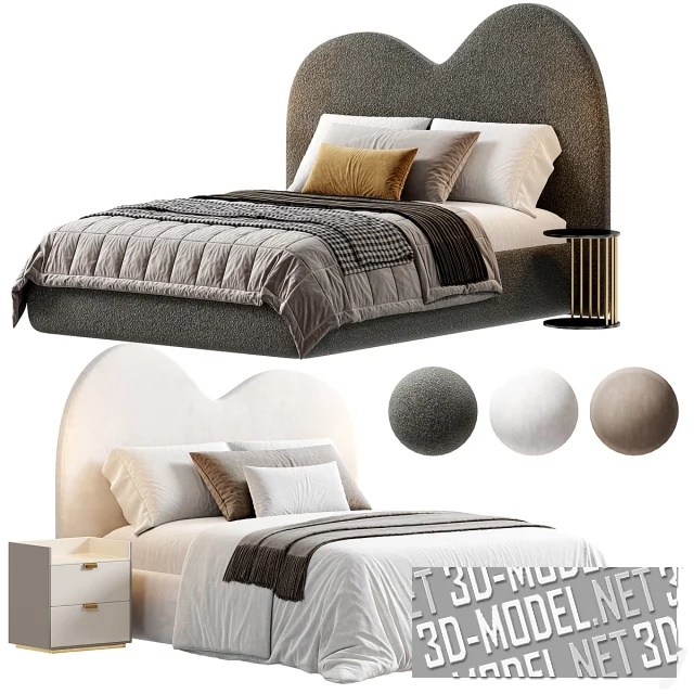 Современная кровать от Zenndesign с высоким мягким фигурным изголовьем. Верхний срез изголовья выполнен в виде двух разновысоких скругленных «холмов». Три варианта кроватей обиты разными материалами: белым и бежевым велюром, темно-серым буклированным текстилем. Белая кровать оснащена белой квадратной прикроватной тумбой с двумя выдвижными ящиками. Темно-серая буклированная кровать укомплектована круглым приставным столиком с черной столешницей и площадкой, соединенных несколькими вертикальными золотистыми перемычками. Постельное белье в основном белое, дополненное пледами и декоративными подушками в охристо-серо-коричневых сочетаниях.