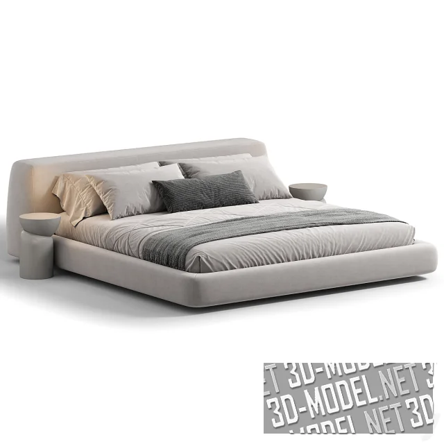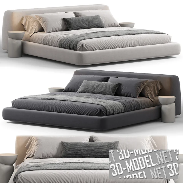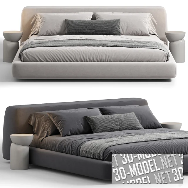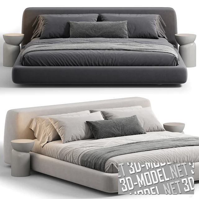 Минималистичная современная кровать Siena Fly от como, в комплекте с круглыми прикроватными столиками. Широкий корпус с мягкой обивкой дополняет низкое, массивное прямое изголовье с расширяющейся базой. Кромки и грани мягкой обивки создают уютный силуэт кровати. Представлена в двух вариантах велюровой обивки: белого и темно-серого цветов. Постельное белье подобрано в цвет обивки и дополнено горизонтальной декоративной подушкой и пледом с мелким черно-белым паттерном. Ножки кровати размещены глубоко внутри и не просматриваются снаружи, создавая эффект парения. Приставные столики состоят из двух элементов, асимметрично соединенных друг с другом - цилиндрической опорой и срезанной полусферой столешницы.