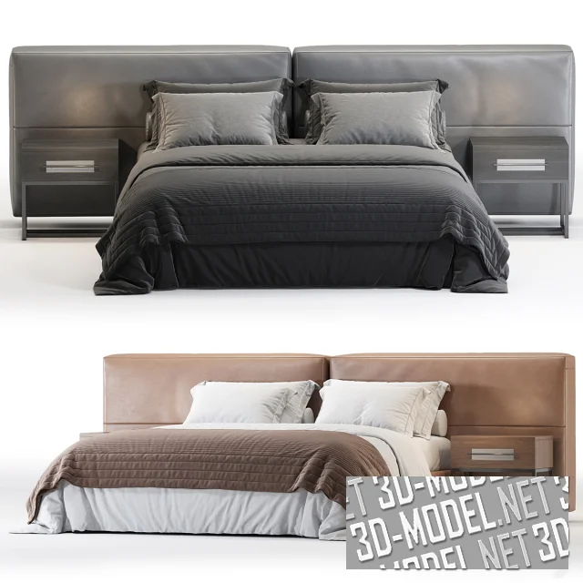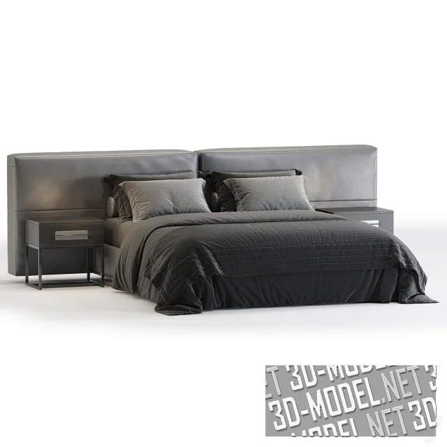 Современная двухспальная кровать с низким широким мягким изголовьем и прикроватными тумбами - модель из коллекции Brera от итальянской фабрики (дизайнер: Jean-Marie Massaud). Изголовье состоит из двух массивных прямоугольных горизонтальных элементов с кожаной обивкой, разделенной пополам горизонтальной строчкой. Предлагается в двух вариантах: с охристой кожаной обивкой, с белым постельным бельем и коричневым одеялом; с графитово-черной кожаной обивкой, с черными и темно-серыми подушками, черным постельным бельем и одеялом. Прикроватные тумбы с выдвижным ящиком в корпусе, смонтированном на черном металлическом каркасе подставки, выполнены в цвет обивки. Габариты кровати: 250х320х100см. Габарит тумбы: 40х55х52см.