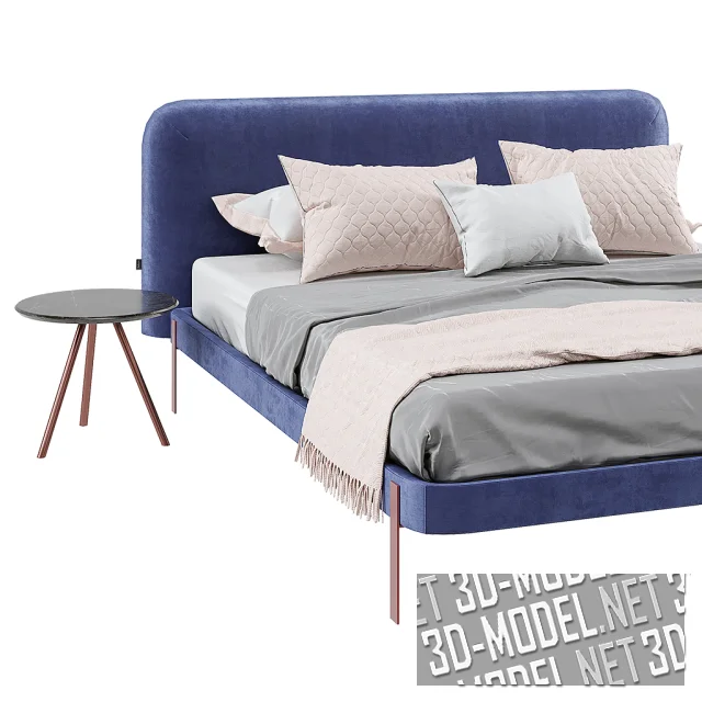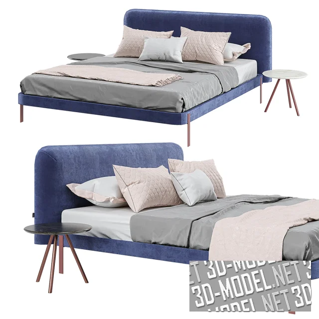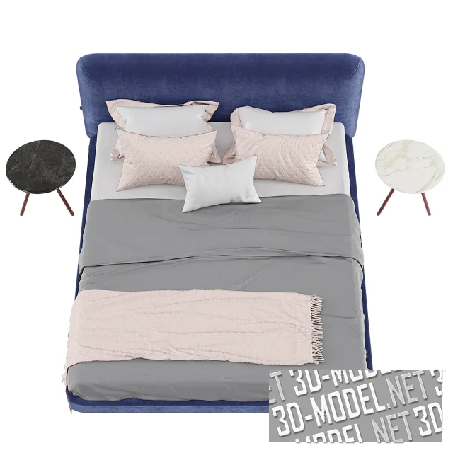 Минималистичная двухспальная кровать в скандинавском стиле - модель Joy Sottile от Bolzan letti, в комплекте с прикроватными трехногими столиками. Круглая столешница представлена в двух вариантах текстур: черный мрамор со светлыми прожилками и белый мрамор с серыми прожилками.