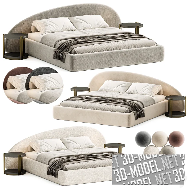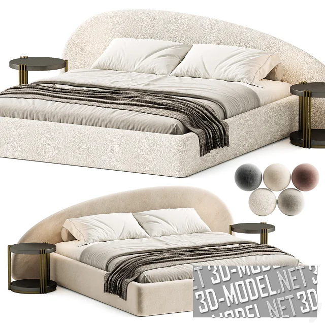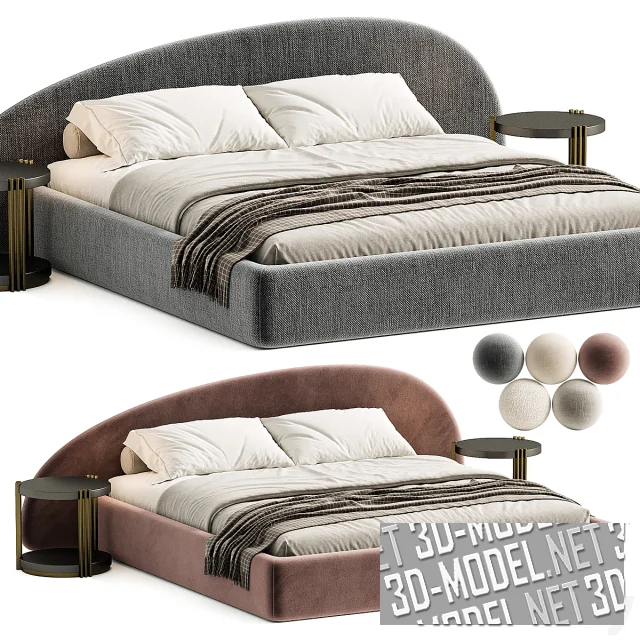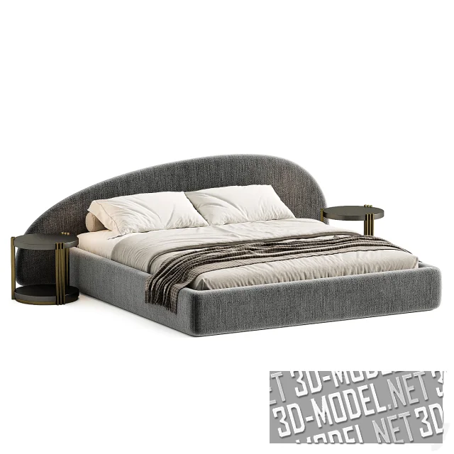 Современная двухспальная кровать Kio от Siori, с парой круглых прикроватных столиков в комплекте. Ассиметричное скругленное изголовье и корпус обиты текстилем пяти видов (темно-серый и светло-серый с текстурой холста, белое букле, коричневый и кремовый велюр). Белое постельное белье дополнено светло-серым одеялом и темным клетчатым пледом. Черные круглые столешницы тумб и круглые нижние полки на цоколях соединены тремя опорами, состоящими из трех латунных прутков каждая.