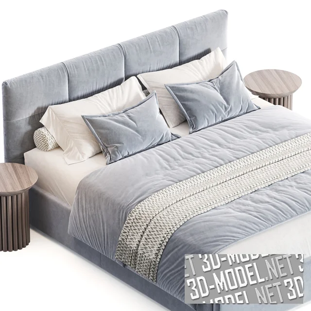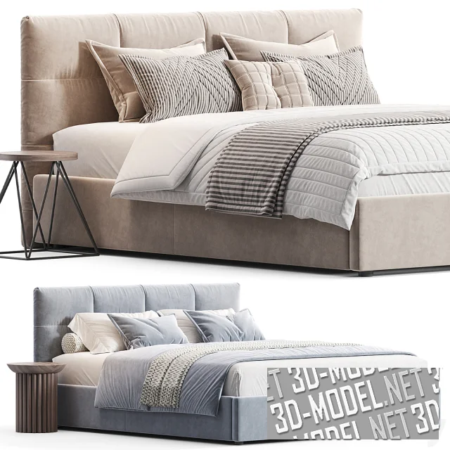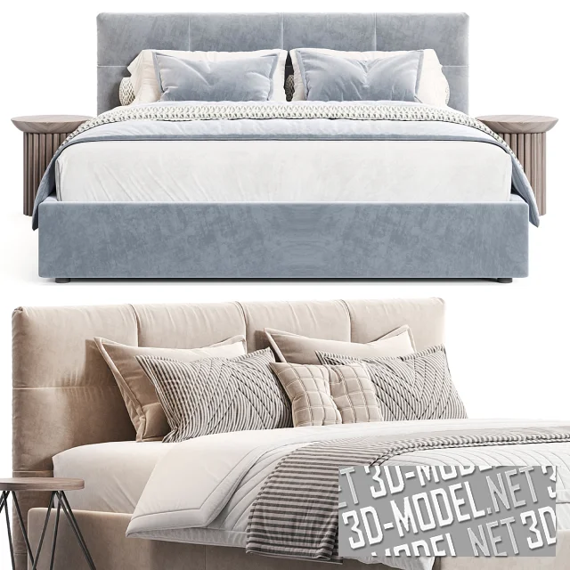 Современная двухспальная кровать Michelle от Blest, с мягким прямым высоким изголовьем. Складки и прострочка на изголовье разделяют плоскость на несколько мягких выпуклых прямоугольников (по 4 в трех рядах). Представлено два комплекта (кровать и два круглых прикроватных столика): с серо-голубой обивкой и с бежевой обивкой. Пледы и чехлы подушек из текстиля с геометрическими паттернами.