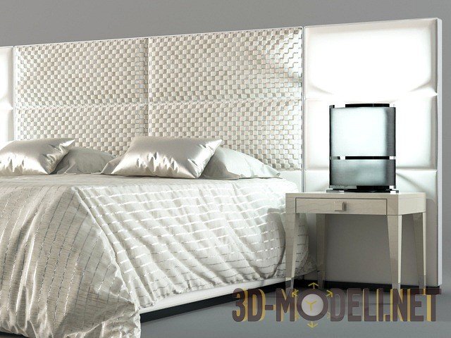 3D модель двуспальной кровати Regent Fendi Casa. Прекрасная модель в современном стиле, с большим комбинированным изголовьем и прикроватными тумбами на ножках. Укомплектована постельным бельем и светильниками. Детальная, реалистичная, с текстурами.