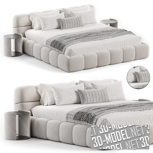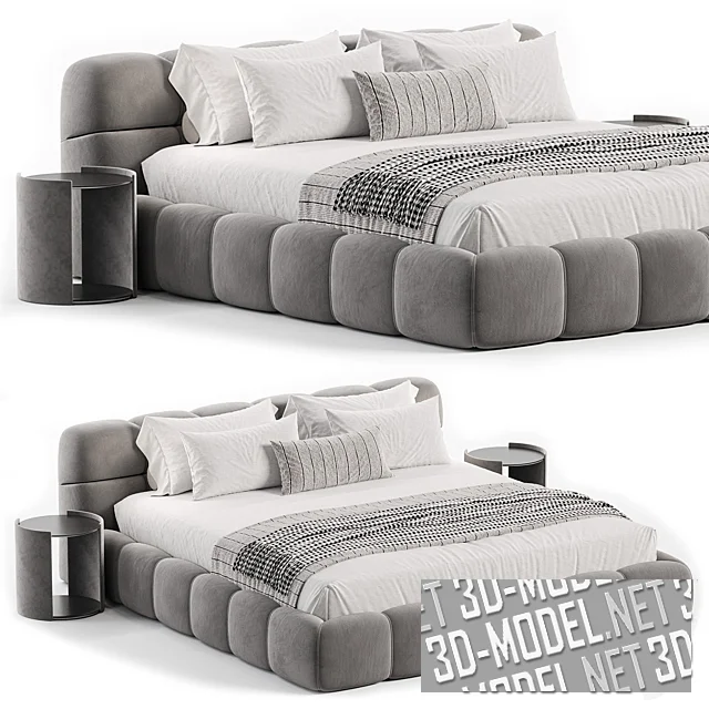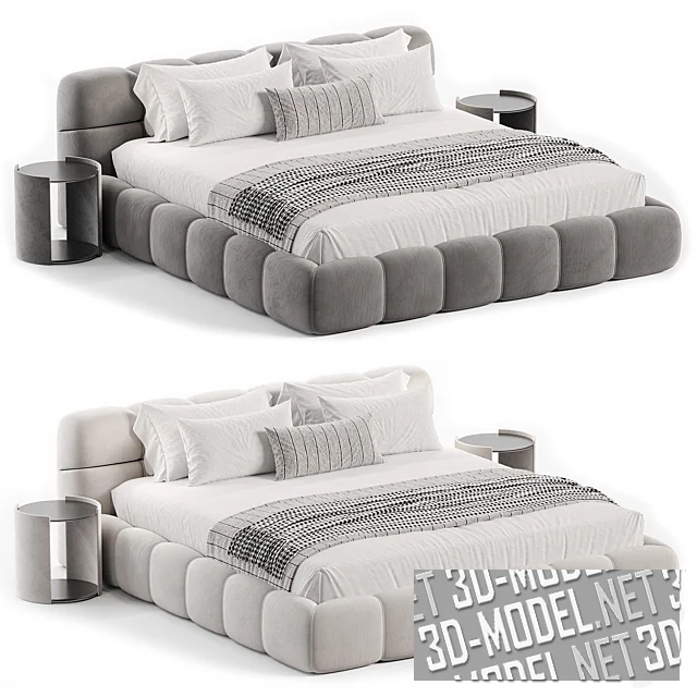 Современная двухспальная кровать Tufty. Борта корпуса и невысокое прямое изголовье обито текстилем (белого или серого цветов) с разделенными прострочкой мягкими сегментами. Постельное белье белого цвета, с полосатыми пледами и чехлом небольшой декоративной подушки. Кровать дополняют две цилиндрические прикроватные тумбы в современном стиле, с парами круглых черных плоскостей (столешница и полка внизу) между двух выгнутых прямоугольных опор в цвет обивки.